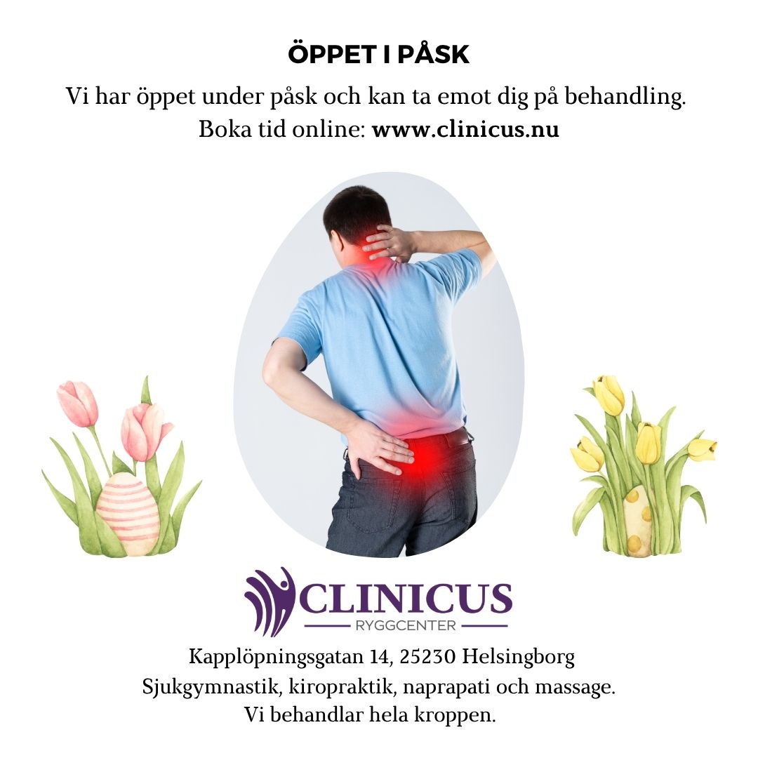 Vi på Clinicus Ryggcenter i Helsingborg har öppet i påsk på långfredag, påskdagen och annandag påsk och kan ta emot dig på behandling. Du bokar tid enkelt online via vår bokningslänk: boka tid här