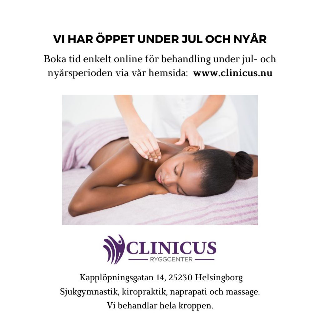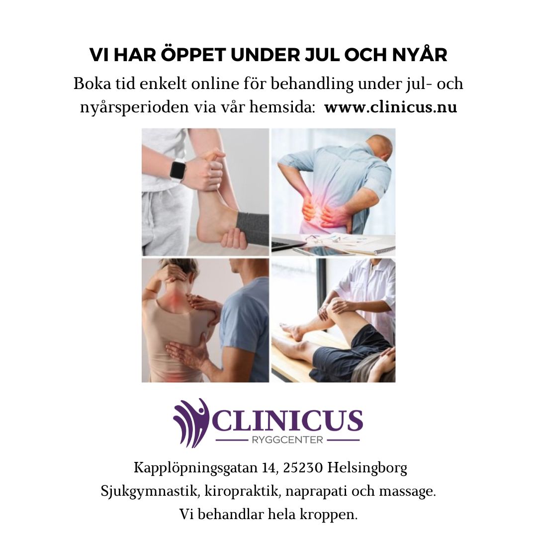 Vi har öppet under jul- och nyårsperioden och kan ta emot dig på behandling. Vi erbjuder kiropraktik, sjukgymnastik, naprapati och massage. Du bokar tid enkelt online via vår bokningslänk: boka tid här